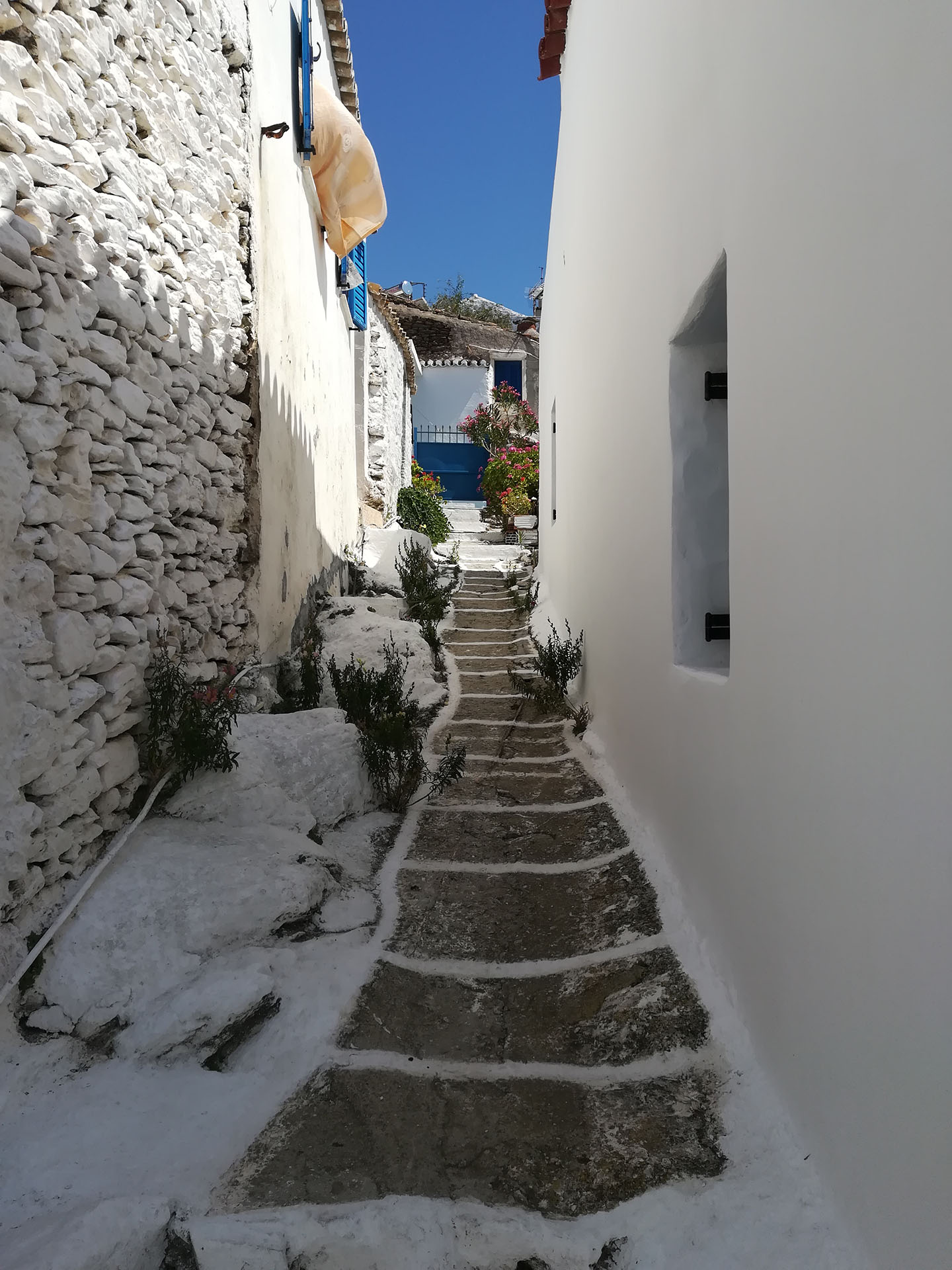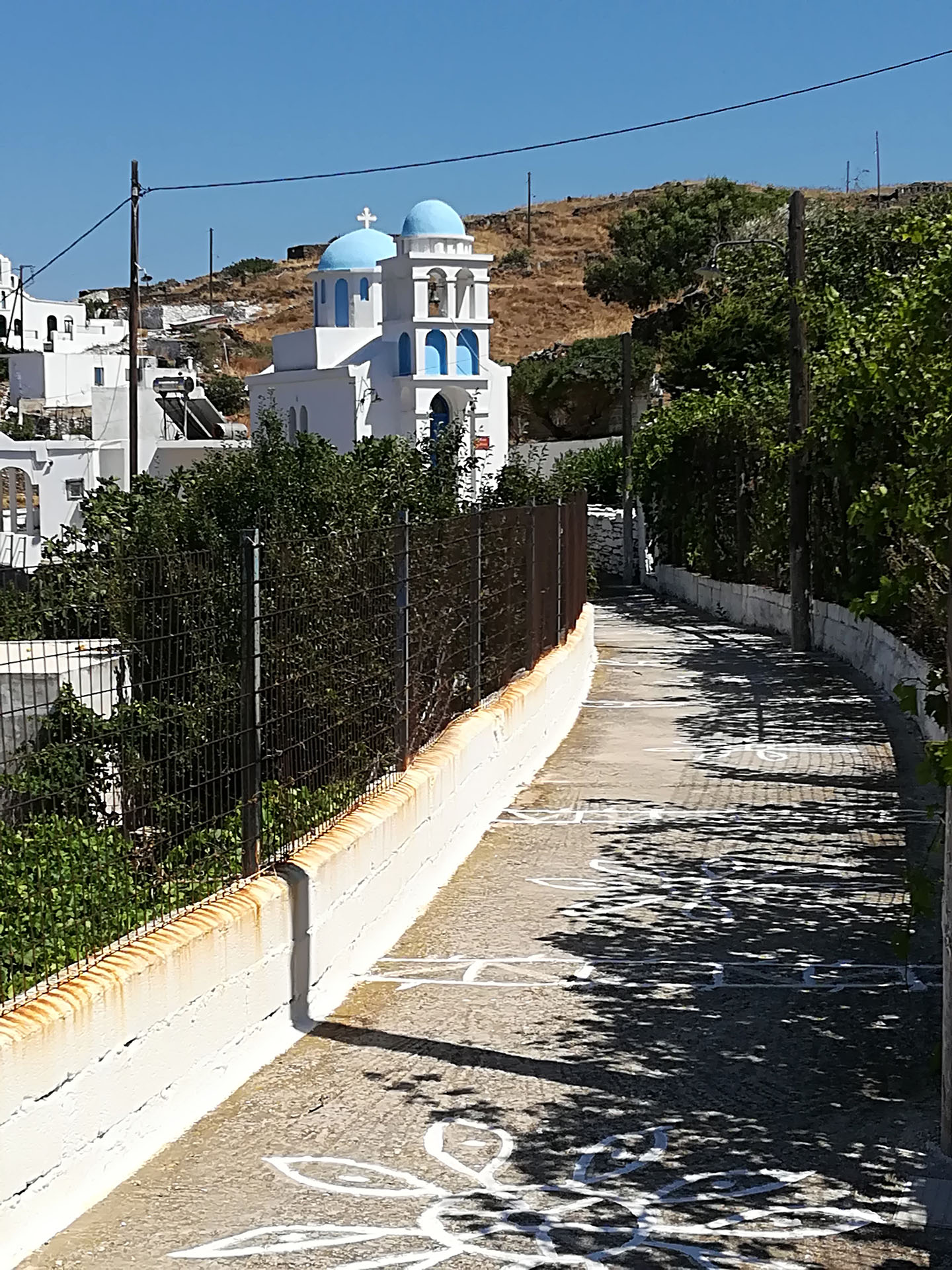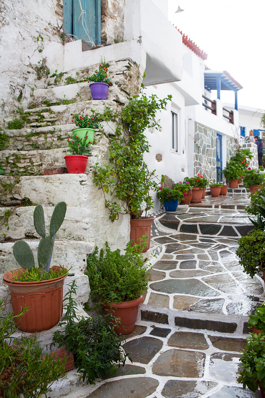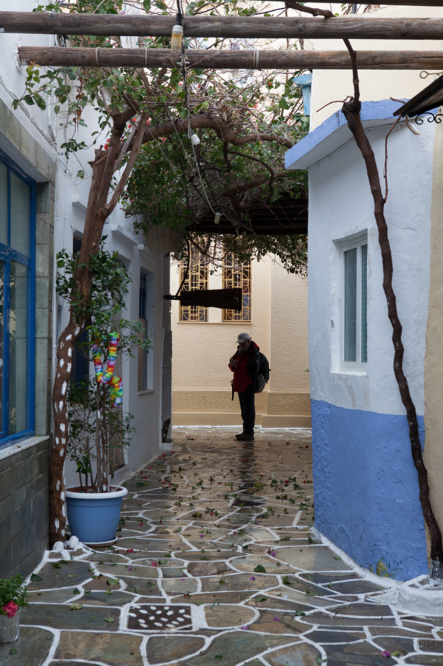 Η ξενάγηση συνεχίζει μέσα από το κεντρικό σοκάκι του χωριού την λεγόμενη πιάτσα. Εκεί θα χαιρετήσουμε της κυρίες του χωριού που κατά πάσα πιθανότητα θα κάθονται εκεί πίνοντας τον καφέ τους και συζητώντας τα νέα του νησιού.