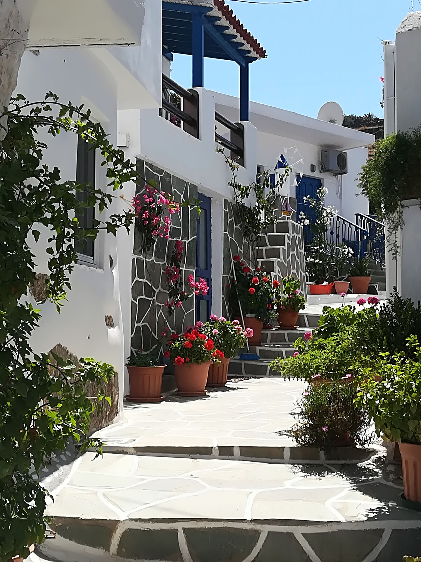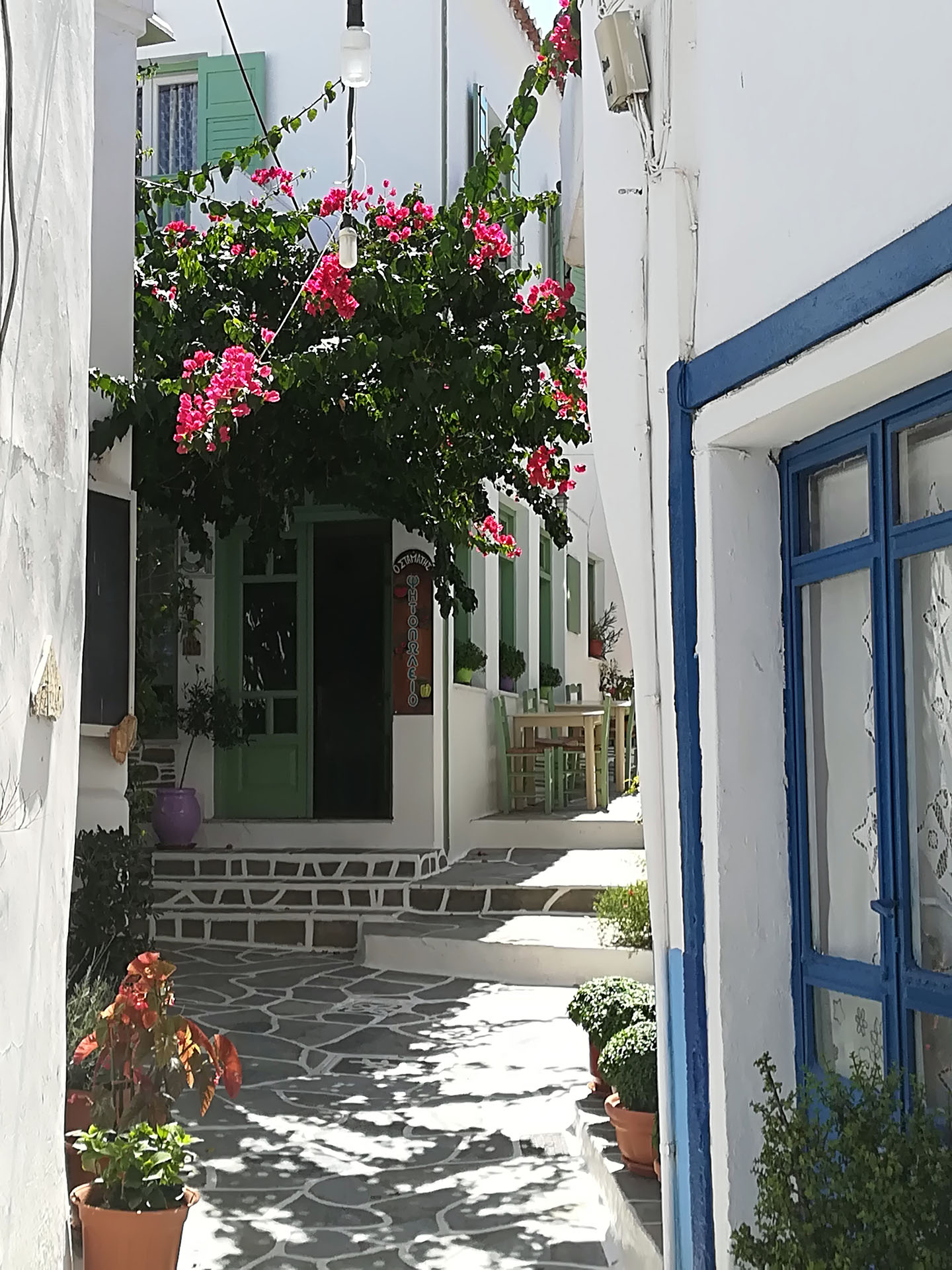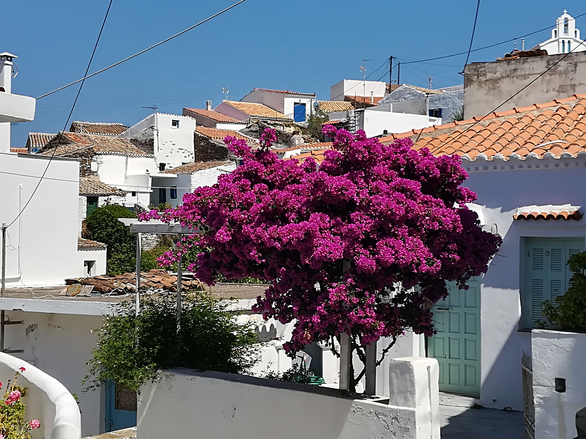 Η ξενάγηση συνεχίζει μέσα από το κεντρικό σοκάκι του χωριού την λεγόμενη πιάτσα. Εκεί θα χαιρετήσουμε της κυρίες του χωριού που κατά πάσα πιθανότητα θα κάθονται εκεί πίνοντας τον καφέ τους και συζητώντας τα νέα του νησιού.