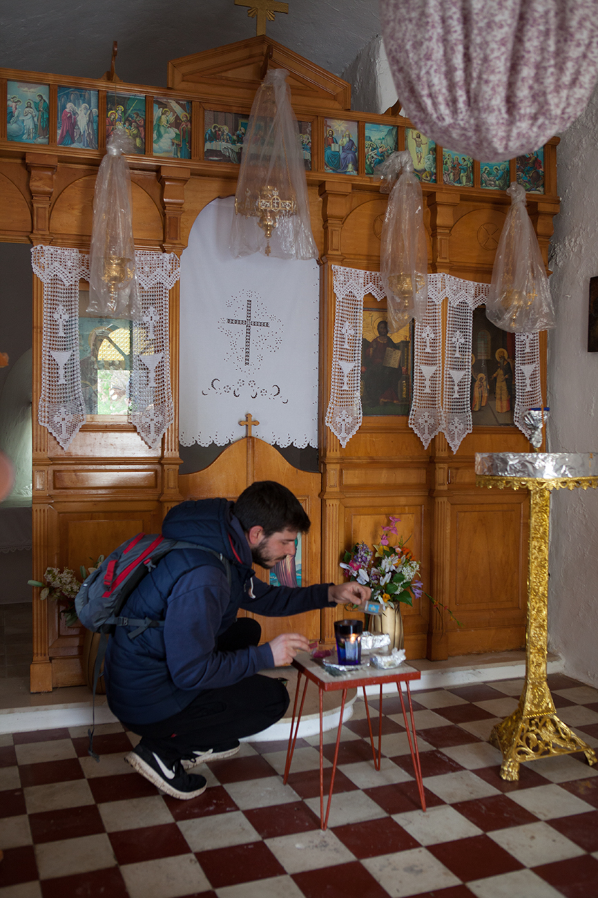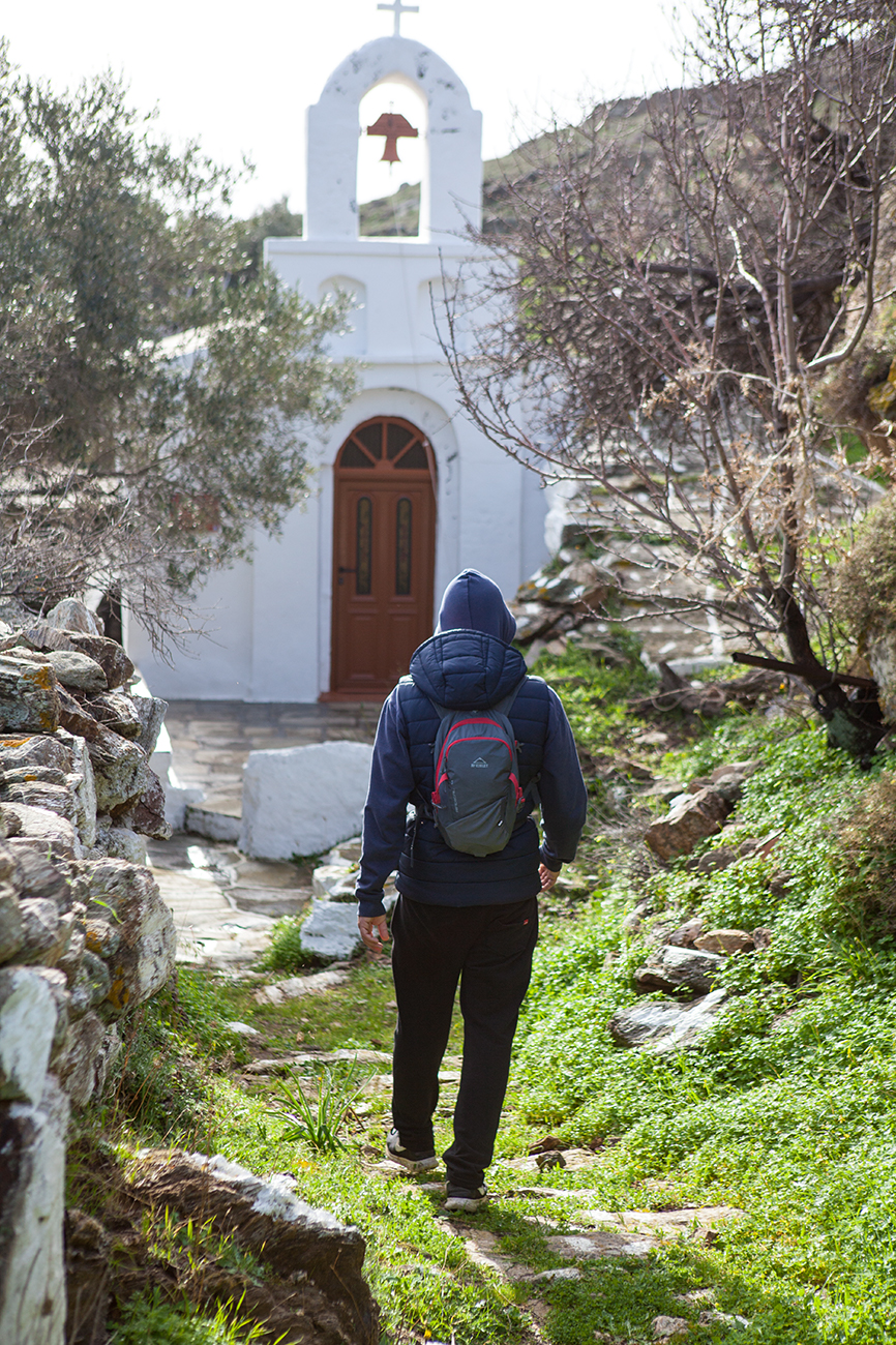 Η πεζοπορία μας στη Δρυοπίδα ξεκινά μπαίνοντας στο χωριό με την μεγαλύτερη γειτονιά, τον Γαλατά, στα αριστερά μας. Οι παραδοσιακές κεραμοσκεπές και τα λαβυρινθώδη σοκάκια ξετυλίγονται γύρω μας. Το μονοπάτι μας ακολουθεί τα σοκάκια του χωριού έως τη μητρόπολη και μεγαλύτερη εκκλησία του νησιού της Κύθνου, την Αγία Άννα.